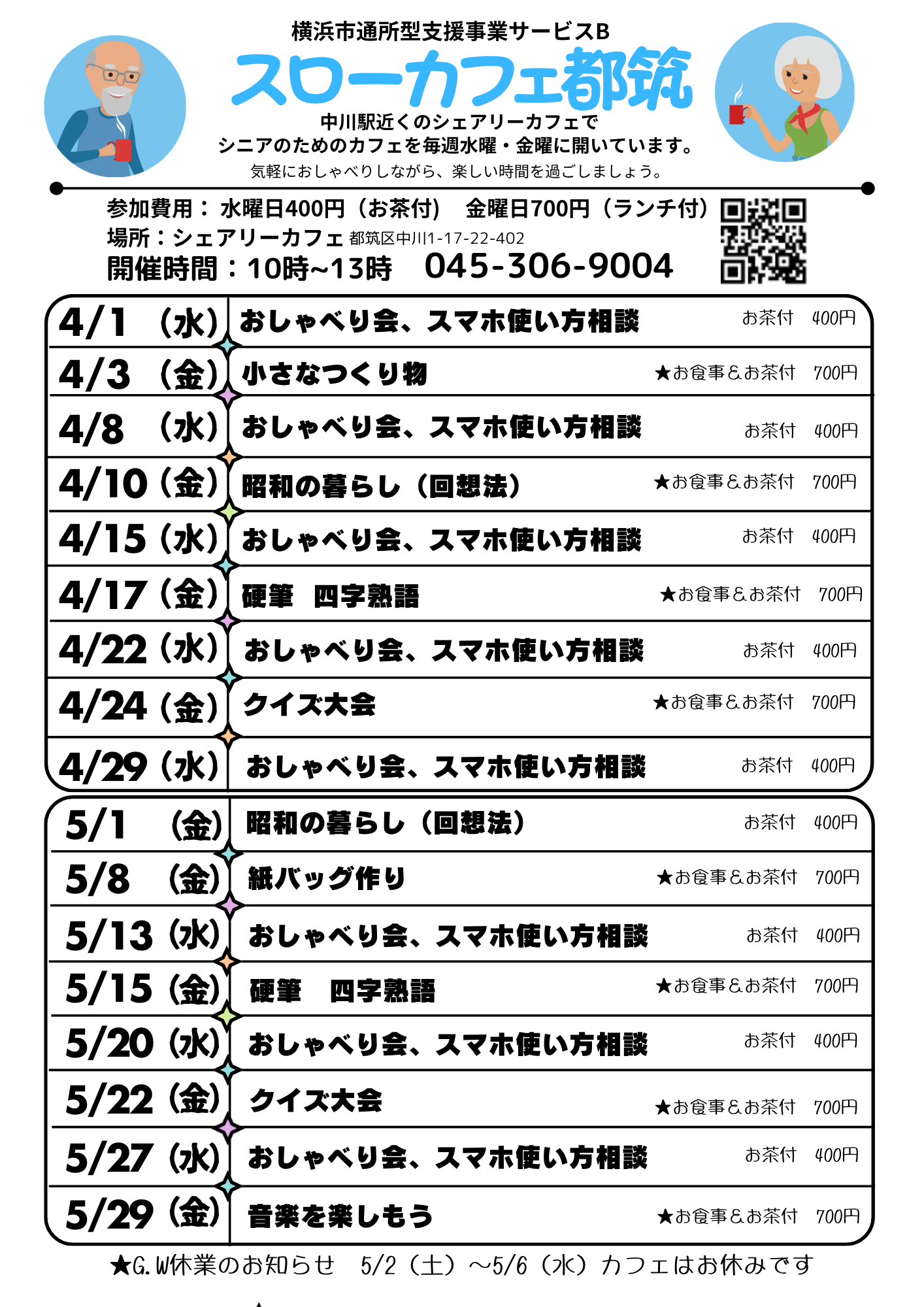 スローカフェ都筑4月&5月スケジュール 2026 3/30 イベント・講座 スローカフェ 通所型支援 2026年3月30日 シニアの方の集いの場。お茶や食事をしながら、おしゃべりしたり、講座を受けたり。ゆるやかなつながりの場です。予約は要りません。お気軽にお越しください。 イベント・講座 スローカフェ 通所型支援 よかったらシェアしてください URLをコピーしました! URLをコピーしました! 4/12,25 訪問看護BLUE*GREEN「ワンコイン・足からの健康相談」